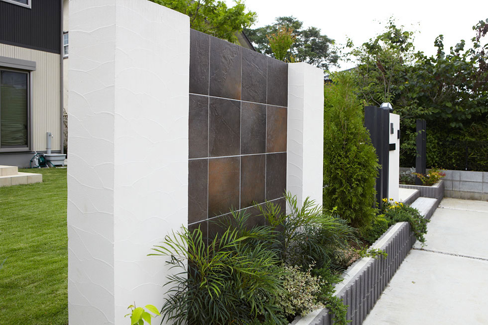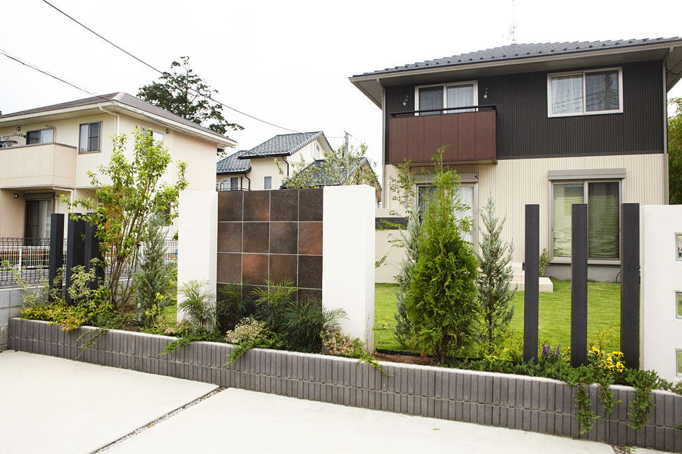 前面の駐車スペースと庭との間に仕切りを設け、デザインウォールと、植栽・柱を組み合わせ、景色としても楽しめる、自然な目隠しをご提案しました。