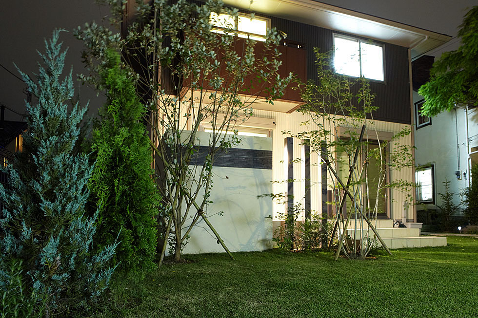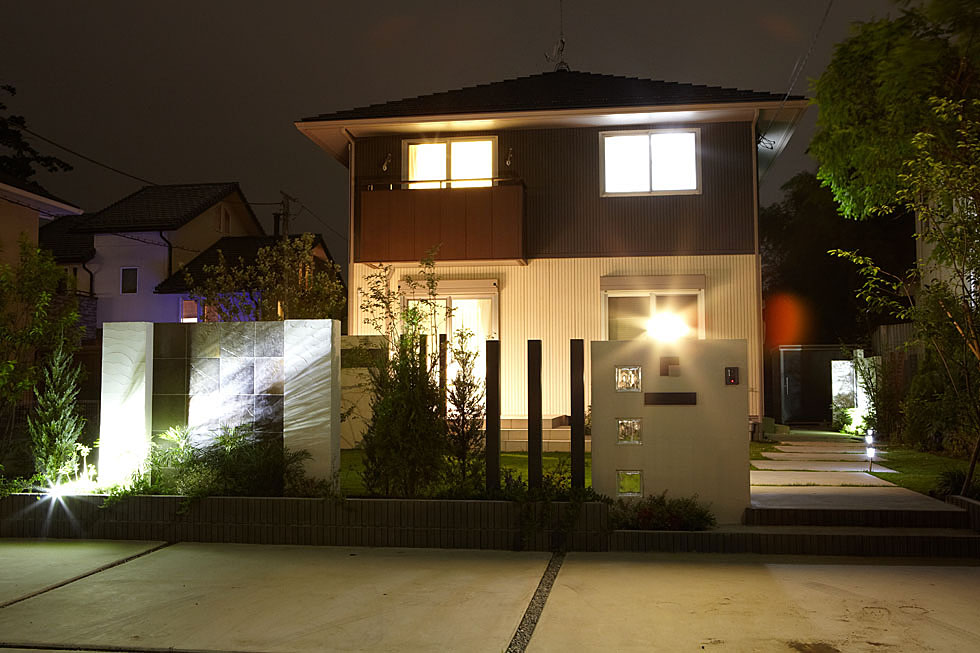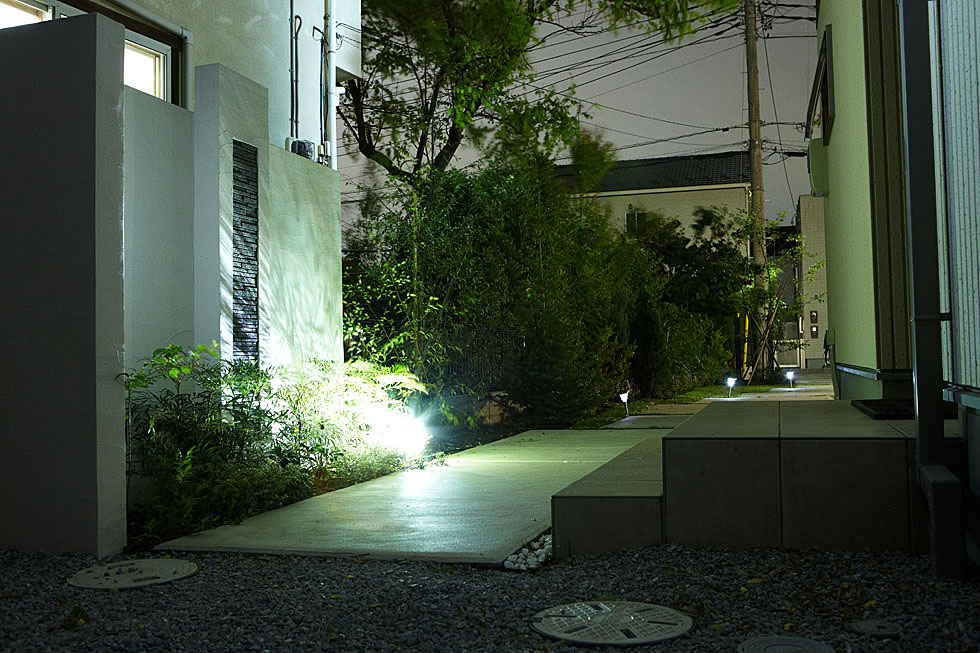 アプローチの先にある玄関まわりを植栽と照明で演出できるよう、背景となるウォールをデザイン。