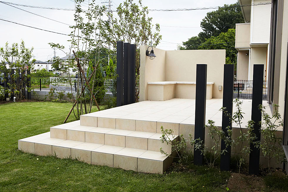 リビングの前には、部屋と庭をつなげるためのタイルデッキをおつくりしました。