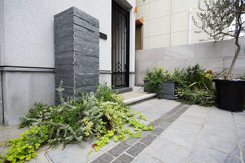建物の外観の雰囲気にあわせて、外構はグレー色で統一し、 洗練されたシックな空間を演出しました。 また同じグレーの中でも、素材感や色の濃淡を重ねることで、 立体感を出すことができました。