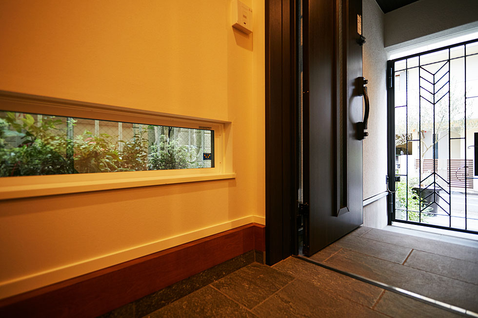 玄関スペースのスリットの隙間や地窓からのぞく景色の中に、 植物を配置することで、内側からも庭の気配を感じることができます。 印象的なアイアンの外扉のデザインにあわせて、 統一感のあるフレームもご提案させていただきました。