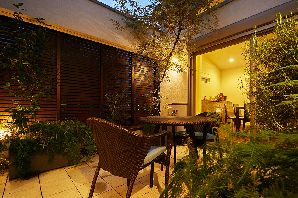 建物に囲まれた中庭のテラスには、室内のインテリアにあったプランターや植物をデザインさせていただきました。 プライバシーを保ちながらも、植物をとりいれることで 開放感を感じてリラックスできる、特別な空間になりました。