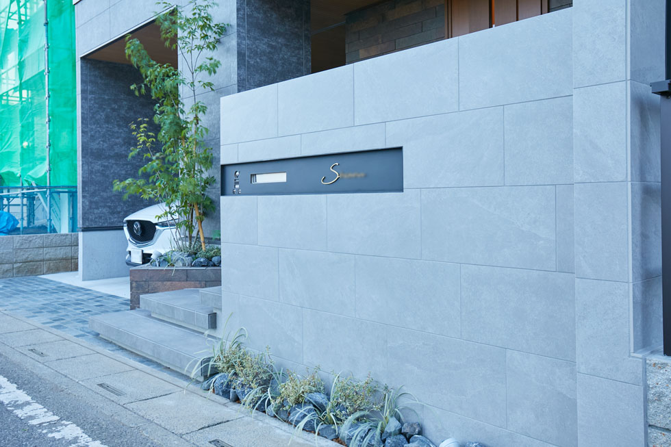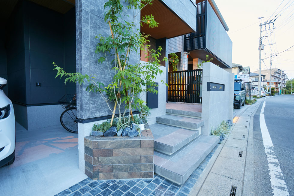 建物の外壁タイルとのバランスも計算しながら ウォールや花壇のタイルの色やサイズ等の素材選びを行いました。 特注のブラックの表札をアクセントに 全体をグレートーンでまとめることでシックな空間になっています。