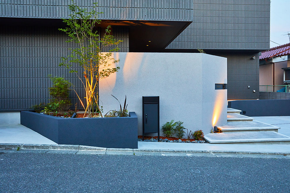 高低差がある敷地の為、道路からの視線をしっかりと遮るには通常のコンクリートブロックでは実現できない高さ約2.5mのウォールが必要でしたが、特殊素材を用いた工法を採用し、デザイン性と安全性を確保しました。またステップや花壇をバランスよく配置することでウォールの圧迫感がでないよう、配慮しました。
