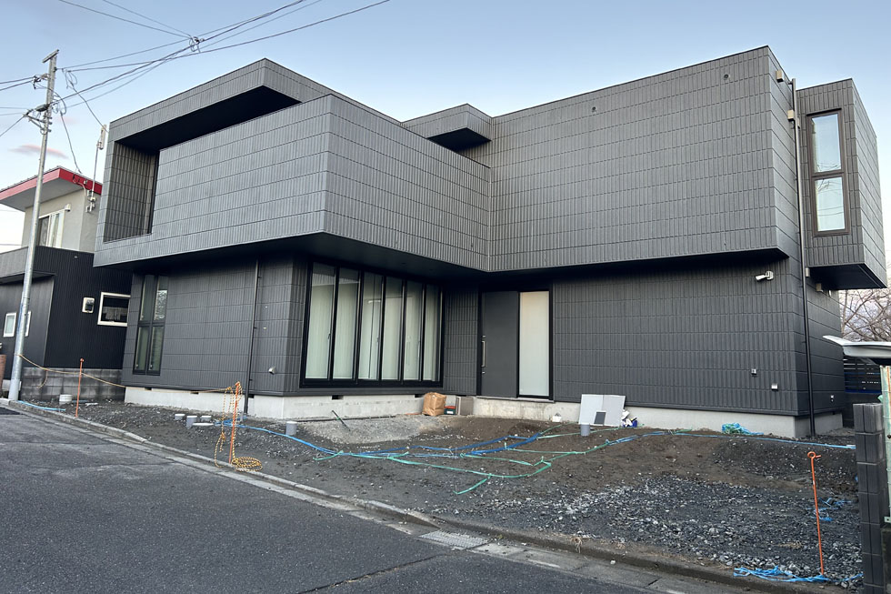 グレーの外壁のモダンなデザインのご自宅。シックな雰囲気の外構デザインにしたいとのご要望でした。また玄関やリビングが道路に面していましたがカーテンをあけてくつろげるよう、しっかりと目隠ししたいとのご相談でした。