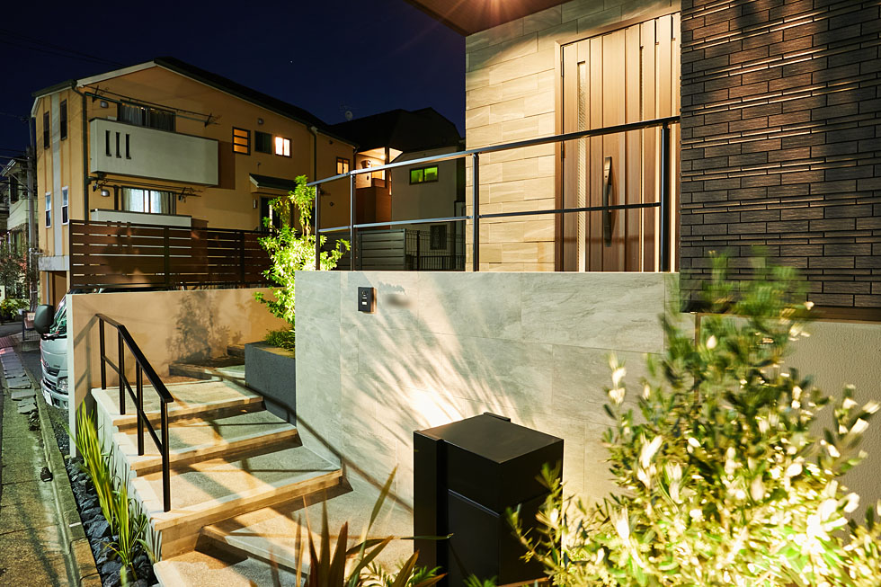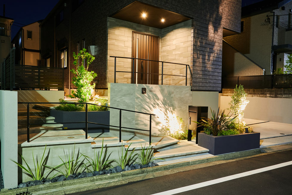 夜は照明演出により、植栽のシルエットが楽しめる あたたかみのある空間に。 高低差のある敷地では、単調な階段になりがちですが、 立体的な敷地の特徴を活かしてデザインすることで、 印象に残る空間を表現することができました。