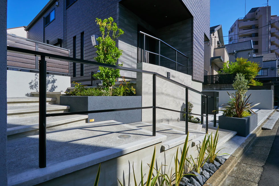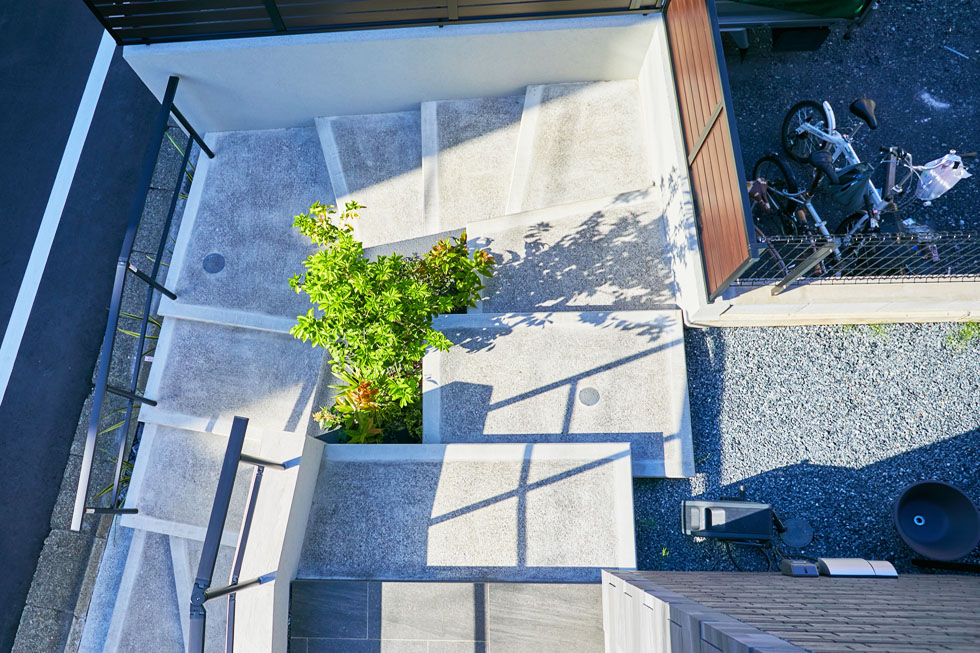高低差のある敷地を活かして、 ダイナミックなフローティングステップをデザインしました。 塀で囲って階段を隠すのではなく、 手すりや植栽と組み合わせてデザインすることで開放的で 立体感のあるモダンな空間を演出できます。