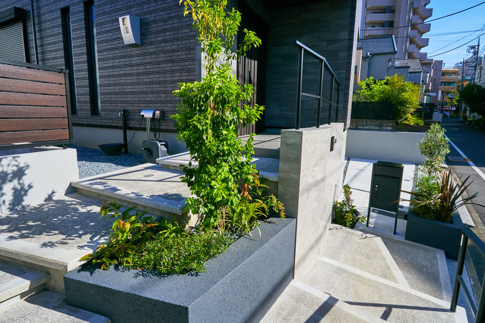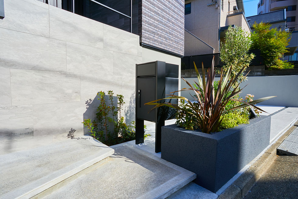 グレーカラーでまとめた空間は冷たい印象になりがちですが、 植栽のグリーンを加えることで柔らかい印象に。 また全体がぼんやりした印象にならないよう、 ポストや花壇などブラックのアイテムを取り入れることで 空間をひきしめています。