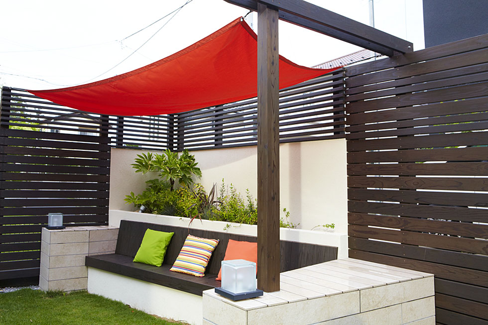 お庭の先には、ご家族でくつろぐことができる、シェード付きのベンチをおつくりしました。 シェードにはアクセントカラーを選び、お揃いのファブリックでクッションもご用意。リゾートの雰囲気をもりあげてくれます。 お庭にちょっとしたくつろげる空間があると、お茶を飲んだり、ご友人が来られたときにおもてなしをしたり。 自然を感じながら、リラックスできる「もうひとつのリビング」として活用できます。