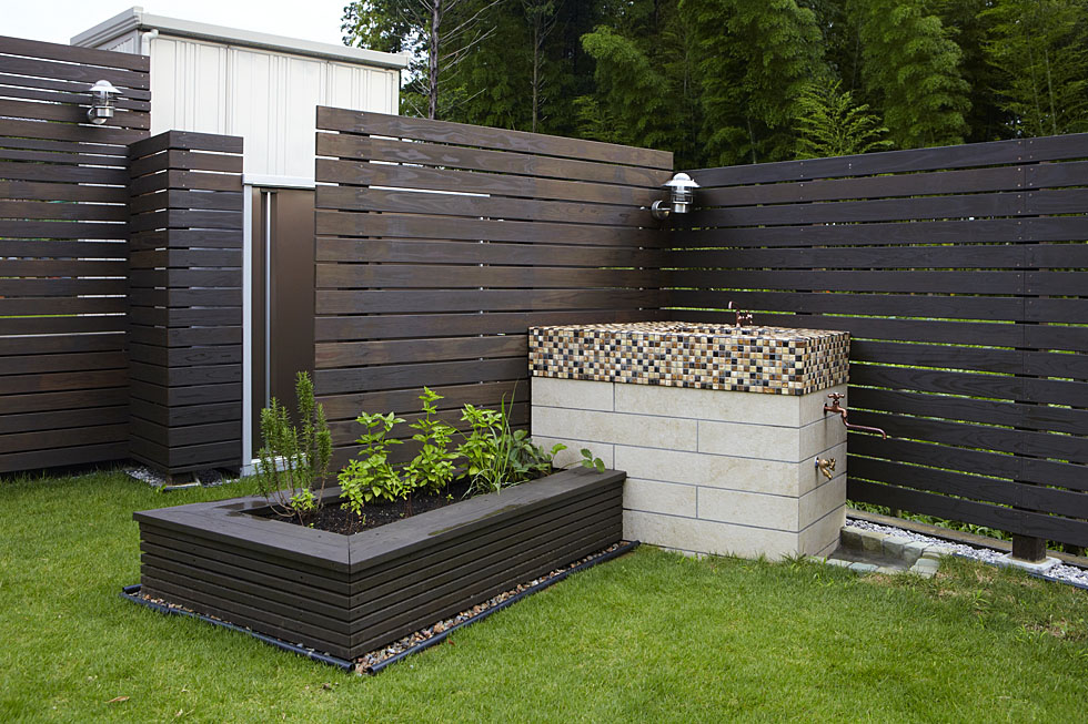 休日にはお友達を招いてBBQをしたい、とのことでしたので、ちょっとした洗い物に便利なガーデンシンクや、お料理に添えるハーブを育てられる花壇をご用意しました。 ガーデンシンクには、ベージュのタイル、天板にアクセントとなるモザイクタイルを貼り、シックなデザインとしています。 花壇は、周りにとけこむようウッドを貼り、形状も台形とし、生活感がですぎないよう、スタイリッシュにまとめました。