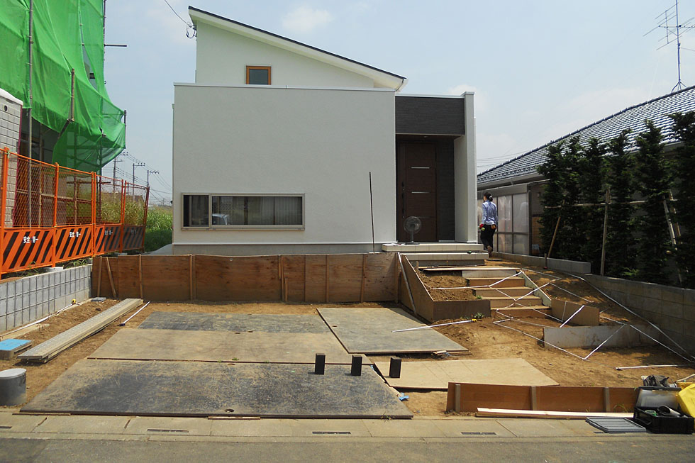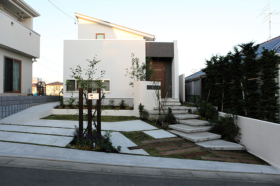 外観にもこだわって建築されたご自宅。 ご主人が建築関係の会社にお勤めということもあり、エクステリアをデザインする上でも、一般的な計画ではない、斬新なアイディアで提案をしてほしい、と強いご要望をいただきました。 またモダンな建物ではあるものの、植栽のデザインを取り入れた、自然な雰囲気を感じられる空間にしてほしい、とのご要望もいただきました。
