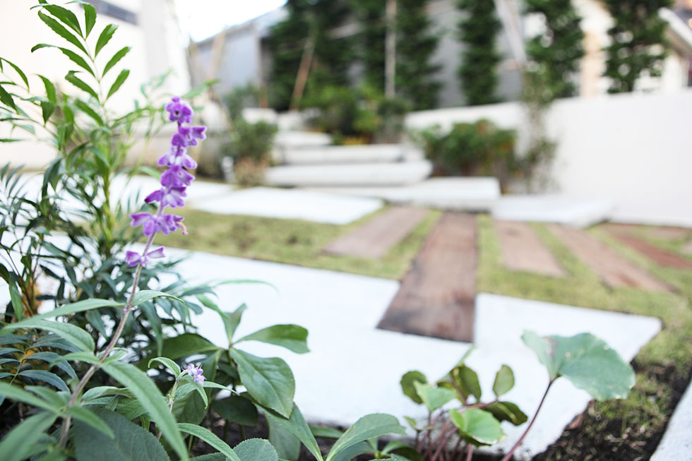 シャープで冷たい印象になりがちなモダンな空間。 植物のグリーンが加わると、生き生きとした自然の心地よさを感じることができます。 コンクリートの床も枕木や芝生を組み合わせることで、殺風景になりがちな駐車スペースが、あたたかみのあるアプローチへと変化します。 自然の素材をバランスよく融合させることで、モダンな空間を、より心地よい空間へ、進化させることができました。
