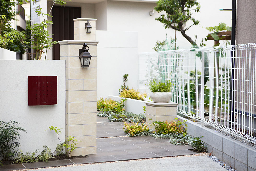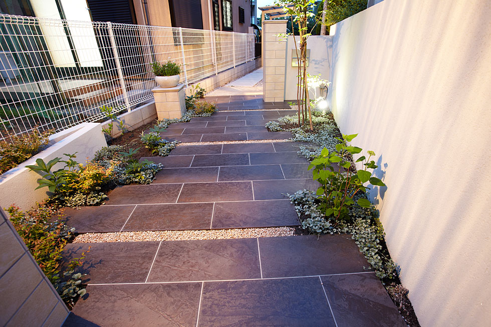 玄関までのアプローチには、濃い色の大判のタイルを使い、落ち着いた雰囲気に。 あえて少しずつ角度をつけて動きをだすことで、広くゆったりとしたアプローチに仕上げています。 両脇は草花で縁どり、四季を通して花や葉の色が楽しめるような植栽を。ご家族が毎日歩くのを楽しめるよう配慮しました。