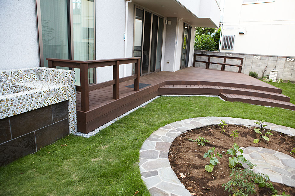 旗竿地の奥には、周囲を住宅地に囲まれた広いお庭がありました。 休日にはご家族とペットのワンちゃんも一緒に遊べるよう、ウッドデッキと芝生のお庭に。 室内のフローリングとウッドデッキをつなげることで、お部屋から眺めても、開放的でゆっくりとくつろげる空間になりました。 デッキ横にはモザイクタイルを貼ったガーデンシンクを併設。お湯も出るので散歩帰りにワンちゃんの足も洗ってあげることもできます。