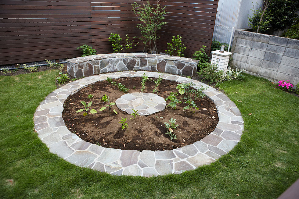 これまではマンション住まいでベランダ菜園を楽しまれていた奥様のために、お庭には菜園もご用意しました。 地味になりがちな菜園も、自然石をサークル状に配置することで、お庭のアクセントに。 周囲からの視線が気になる箇所には、ウッドフェンスで自然な目隠しとベンチを。ゆったりとくつろぎながらお手入れをすることができます。 季節感を感じられる植物を眺めながら、ご家族が安心してくつろげる、そんな空間をおつくりすることができました。