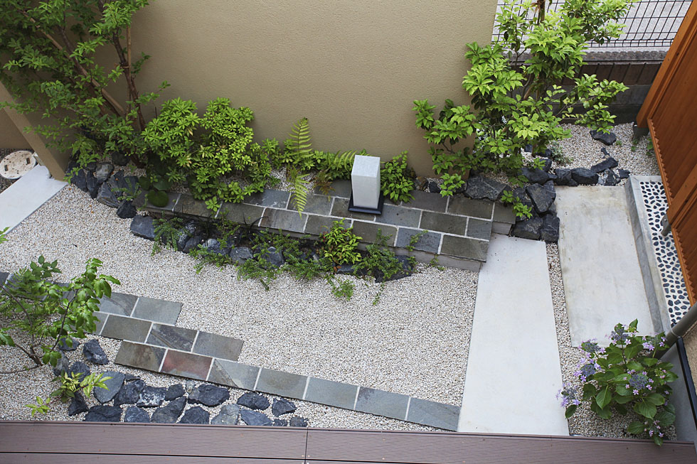 リビングには掘りごたつがあり、ご家族はそちらに座ってくつろぐことが多いとの事。 そこで、座った時にちょうど美しく見える位置にあわせて、お庭の地盤を高く上げ、そこへ和の景色をつくるご提案をしました。 通り道からの視線を遮るために建てたウォールは、お庭の背景にもなり、手前にある植物を引き立ててくれます。 また、掘りごたつに座ると視点が低くなるため、ウォールの上にも風の抜ける格子のフェンスを設置して、上部の視界が抜けないよう配慮しました。