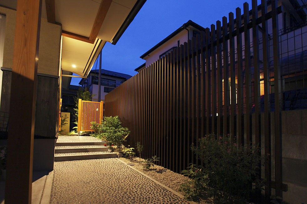玄関やお庭へと続くアプローチにも、格子のフェンスを設置して、奥のお庭への期待感と、和の趣きが感じられる空間を演出しました。 階段にあわせて植栽の高さを調整したり、香りのする草花を入れたりなど、歩きながら楽しめるアプローチに仕上げています。 日が落ちると、照明により格子の陰影が引き立ち、より美しく、雰囲気のある空間へと変化します。