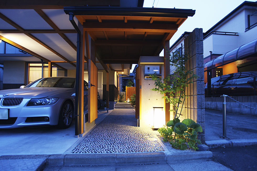 門まわりにも和の趣きが感じられる、モミジやツワブキなどの植栽を配し、まるで料亭のような風情を感じられる空間をおつくりしました。 玄関先のちょっとした空間を利用して、植栽や照明をデザインするだけでも、素敵な門まわりを演出することができます。 ご主人は海外にご出張される機会が多いとの事。 ゲストへのおもてなしはもちろん、ご家族がお帰りになった際にも、ホっとできる空間をおつくりすることができたのではないでしょうか。