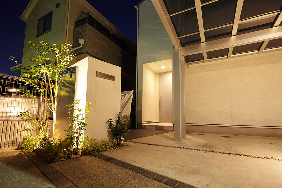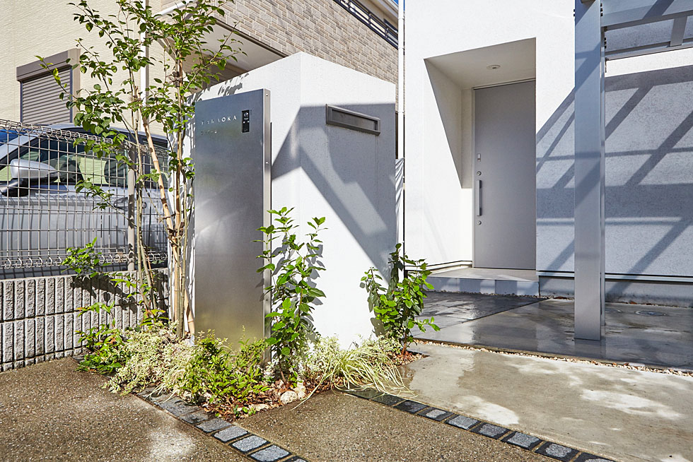 敷地ぎりぎりに壁をたてるのではなく、あえて前に余白をとることで、 ゆったりとした玄関周りを演出できます。