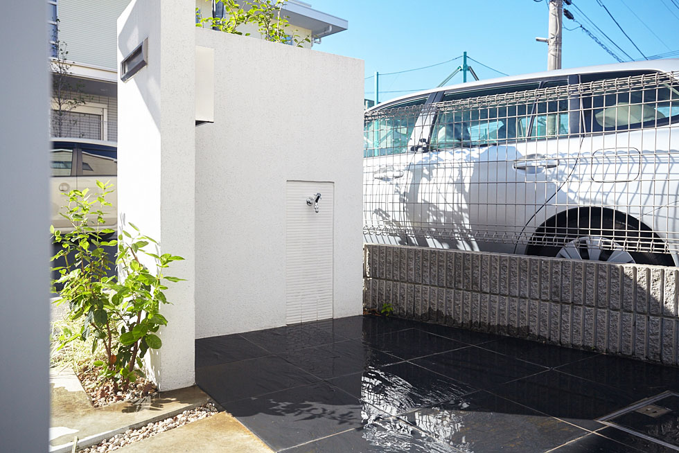 門構えのウォールの裏側には、水栓を組み込んで、機能的なスペースに。