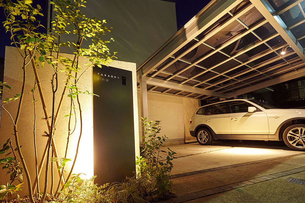 お仕事でデザインを手がけられるご主人は、外構のデザインにもこだわりたい、との事で限られた空間でしたが2台分の駐車スペースをしっかりと確保しつつ、高級感を感じられる外観を。とのご要望でした。