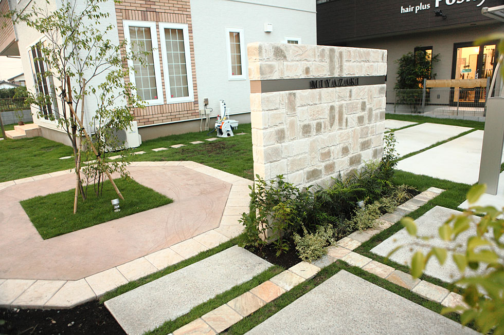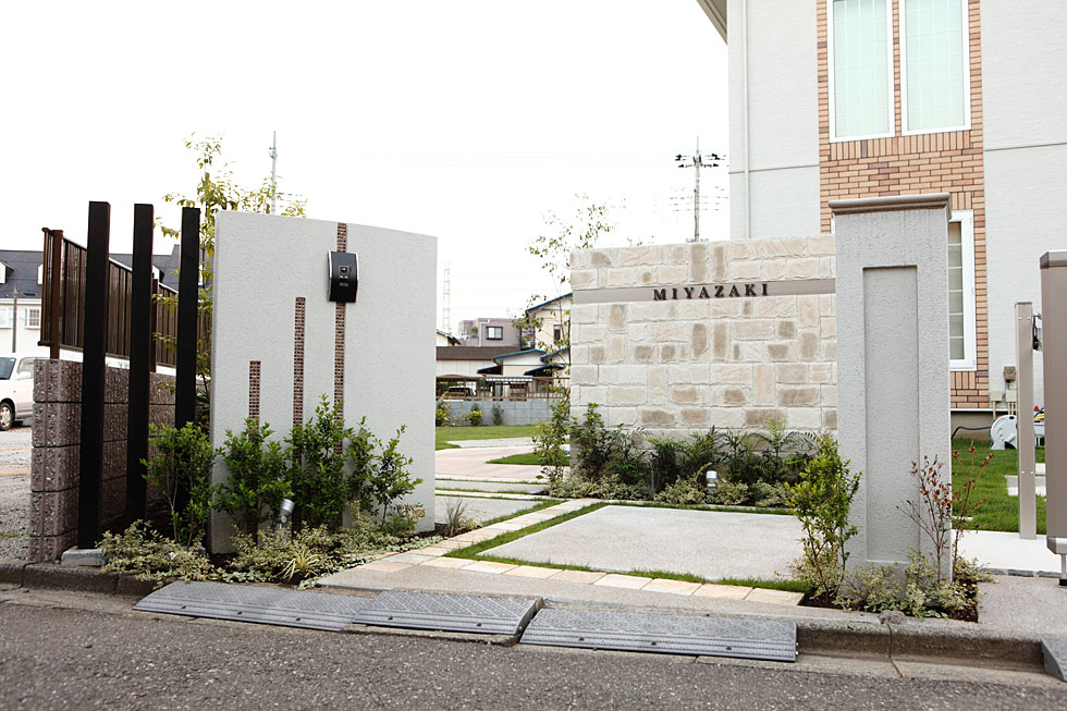 手前と奥に、二段階にウォールを配置し、道路側からは敷地の中は見渡せず、敷地側からは道路への飛出しを防止できる門構えをご提案しました。
