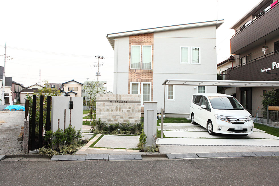 シンプルモダンな形状に、 温かみのあるレンガ調タイルをつかった建物外観にあわせて、エクステリアの素材選びを行いました。