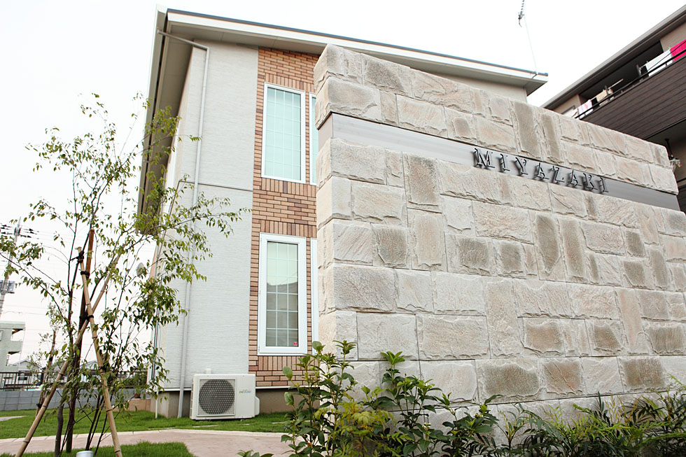 自然な風情が感じられる石材調のウォールには、アルミ素材のラインを組み合わせて、ナチュラルの中にもシャープさを表現しています。