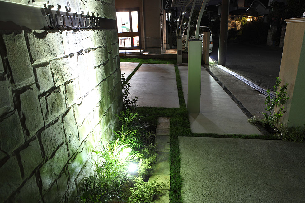 夜になると、ウォールや植物がライトアップされ、光の陰影が浮かび上がります。