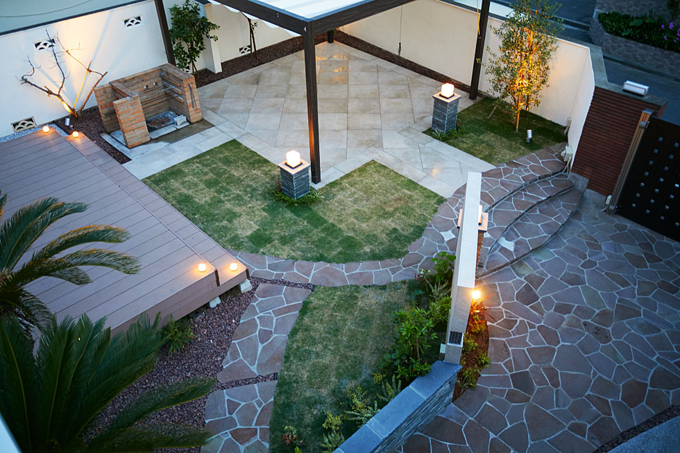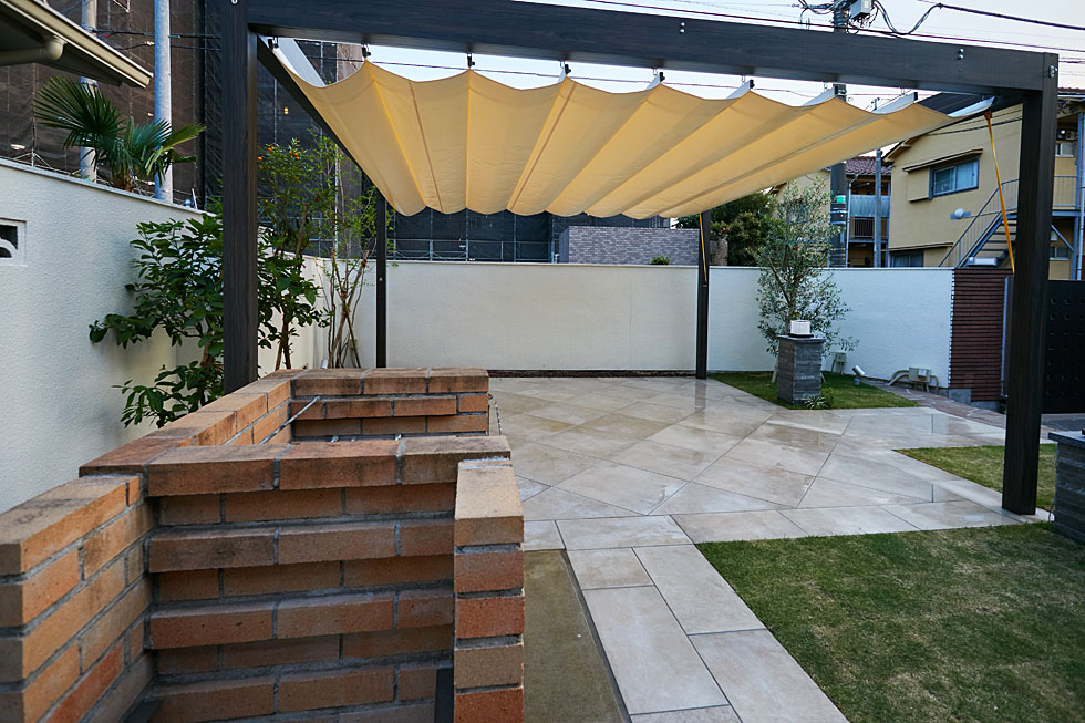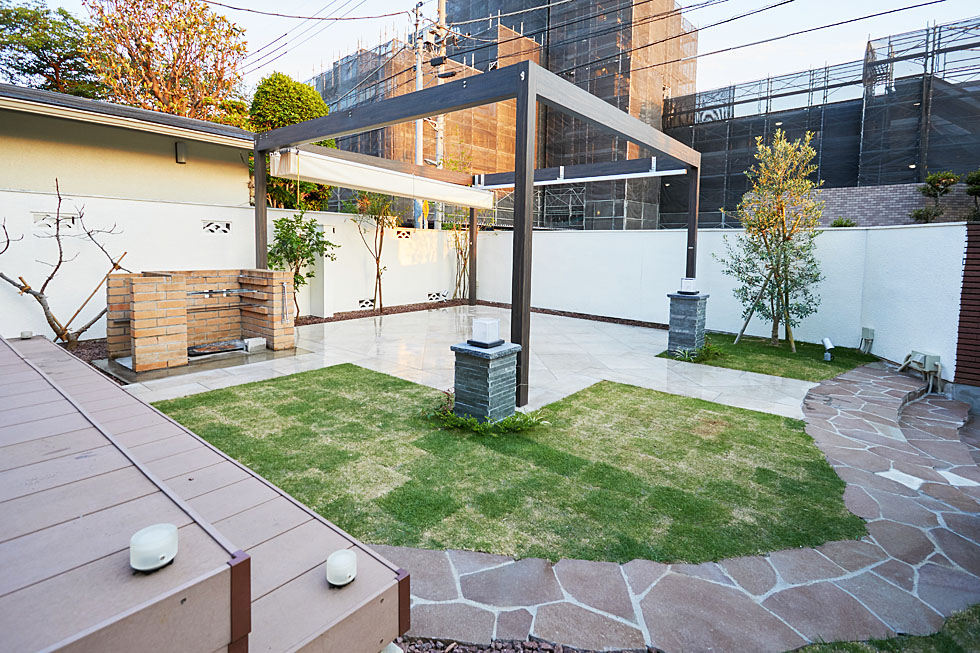 ご家族みなさんで楽しんでいただけるよう、思い切って植物を減らし、 開放的なタイルのテラスをご提案しました。