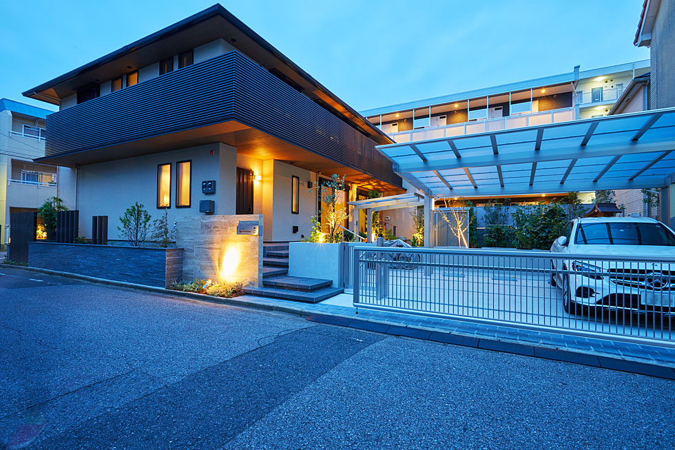 南側の玄関は、タイル貼りのウォールやアルミのカーゲートを設け、 モダンで機能的な空間としましたが、
