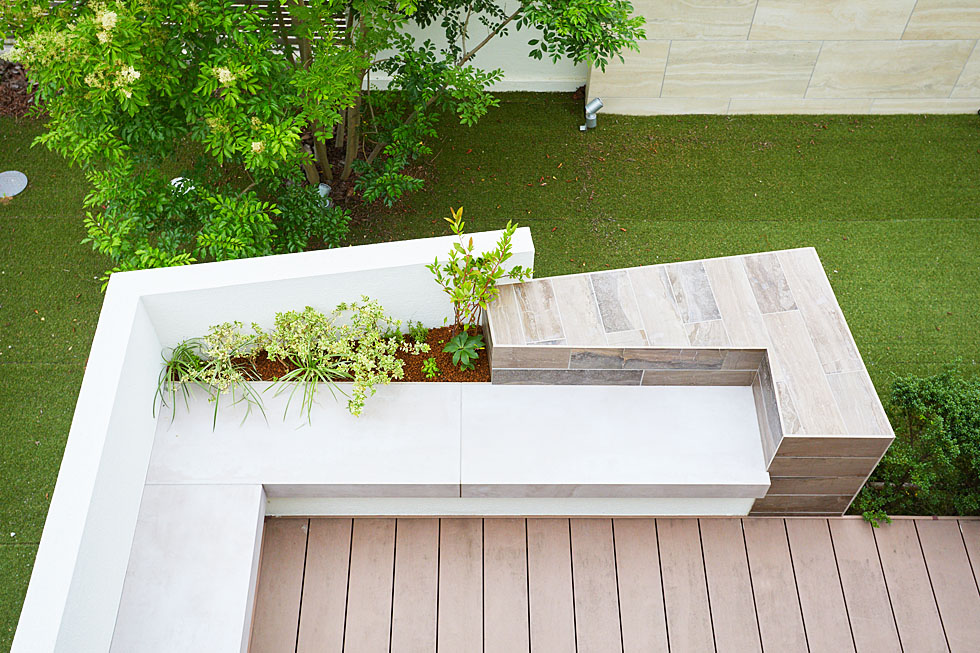 庭には周囲の視線を気にせずくつろげるよう、目隠しのウォールやベンチを設えました。 周りを背の高いウォールで一律に囲ってしまうと圧迫感のある空間になりがちですが、既存のウッドデッキや植栽とのバランスを考えてデザインすることで、開放感を演出することができます。