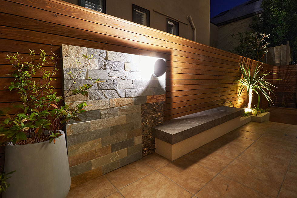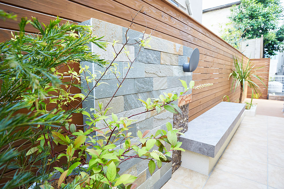 アジアリゾートのテイストがお好みとのご要望があり、 ウッドフェンスを背景に、凹凸のある自然石のウォールや植栽でリゾートの雰囲気を演出しました。 ご主人がご自宅でお仕事をされるときにも、休憩の際に庭に出て、植栽を眺めながリラックスすることができます。