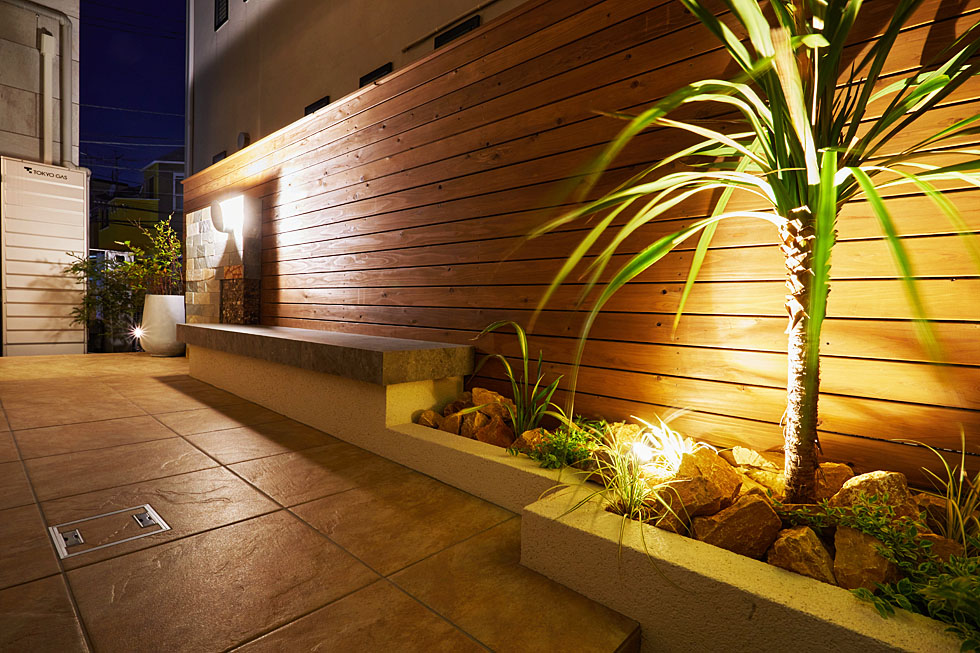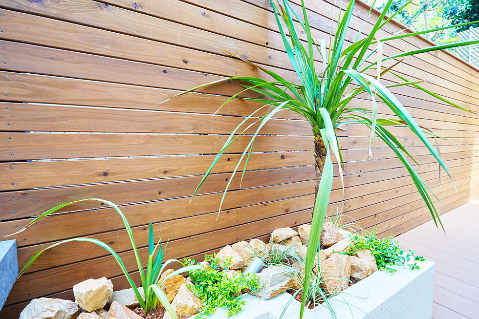お隣との境界をウッドフェンスで囲うことで、周囲の視線を気にせず、 ご家族でゆったりくつろげる空間をデザインしました。 室内からよく見える位置にデザインウォールやベンチを設えることで、 日常の中に景色が溶け込み、リゾート気分を味わうことができます。