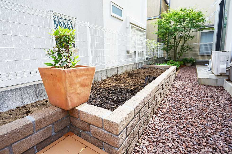 奥様が家庭菜園をされていたスペースも、腰高の花壇を設えることで、 お手入れがしやすくなりました。 植栽以外のスペースにはレンガチップを敷くことで、雑草の手入れも軽減でき、普段目の届かない裏庭も美しく保つことができます。