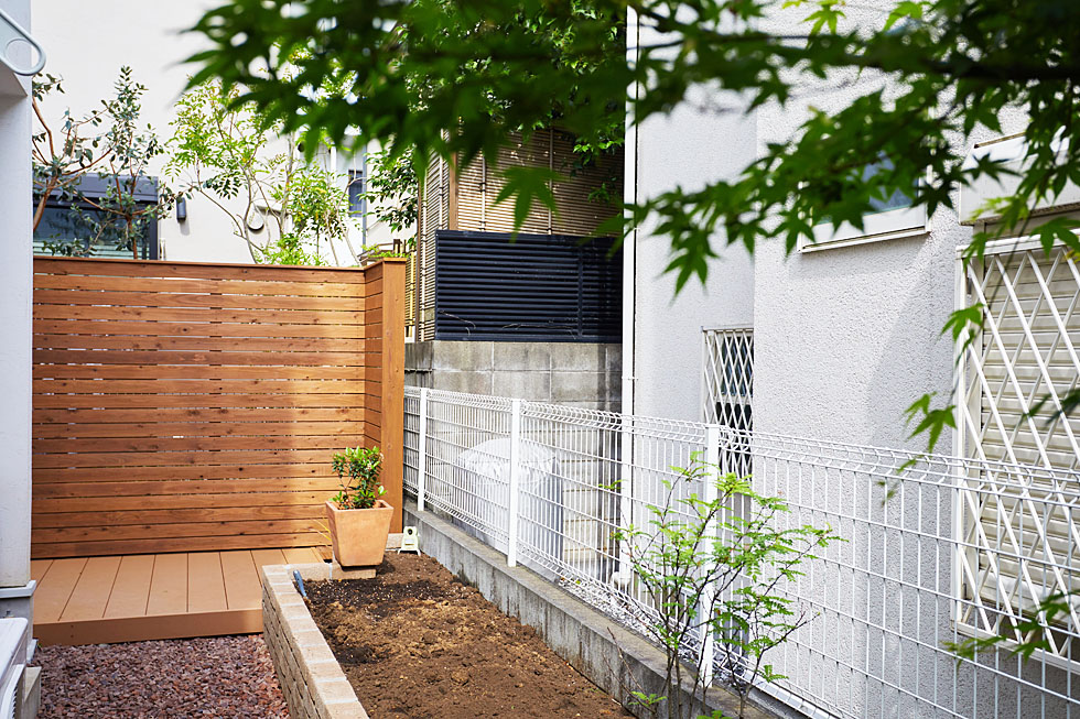 室内からの出入りをしやすい場所には、家族でくつろげる空間と してタイルのテラスを。 裏側は家庭菜園や既存の植栽を楽しめる空間に。 使い道の異なる二つの空間を、ウッドデッキで動線をつなぐことで、気軽に行き来できるよう配慮しました。 限られたスペースを有効活用し、ご家族で楽しむことができる空間になったのではないでしょうか。