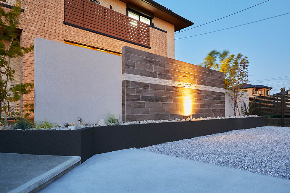 ライティングにより、石材の凹凸や植物のシルエットが浮かび上がり、素材がうみだす陰影を楽しむことができます。 広い敷地でも、ウォールや植物・照明を適切な位置にバランスよく配置することで、視線をカットしながら、安心してくつろげる空間を演出することができます。 ご家族やゲストの方を特別な雰囲気でお迎えできる空間をデザインすることができたのではないでしょうか。