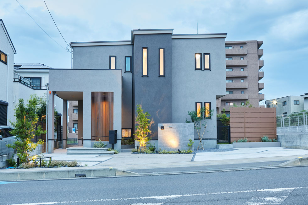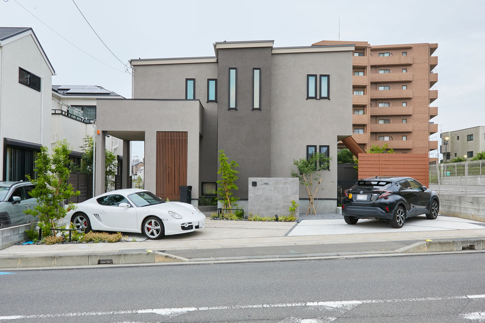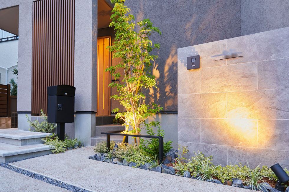 グレーの建物外観を引き立てるよう、 グレーのタイル門柱を中心に、グレーの濃淡を重ねて シックな空間を演出しています。 ブラックのアイテムを差し色に加えることで、 メリハリのある、立体感な空間になりました。