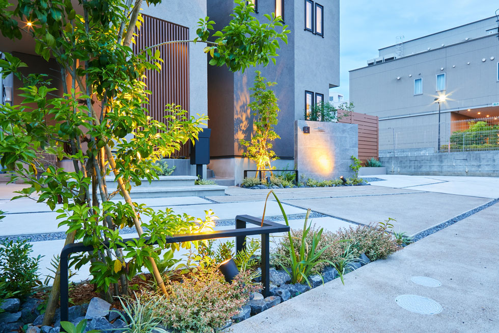 植栽スペースにも、グレーの石材やブラックのフレーム等の アイテムを加えることで、空間全体のトーンをあわせることができました。 照明の演出も加えることで、 建物の外壁に植物の影が映り込み、昼間とは違った景色が楽しめます。