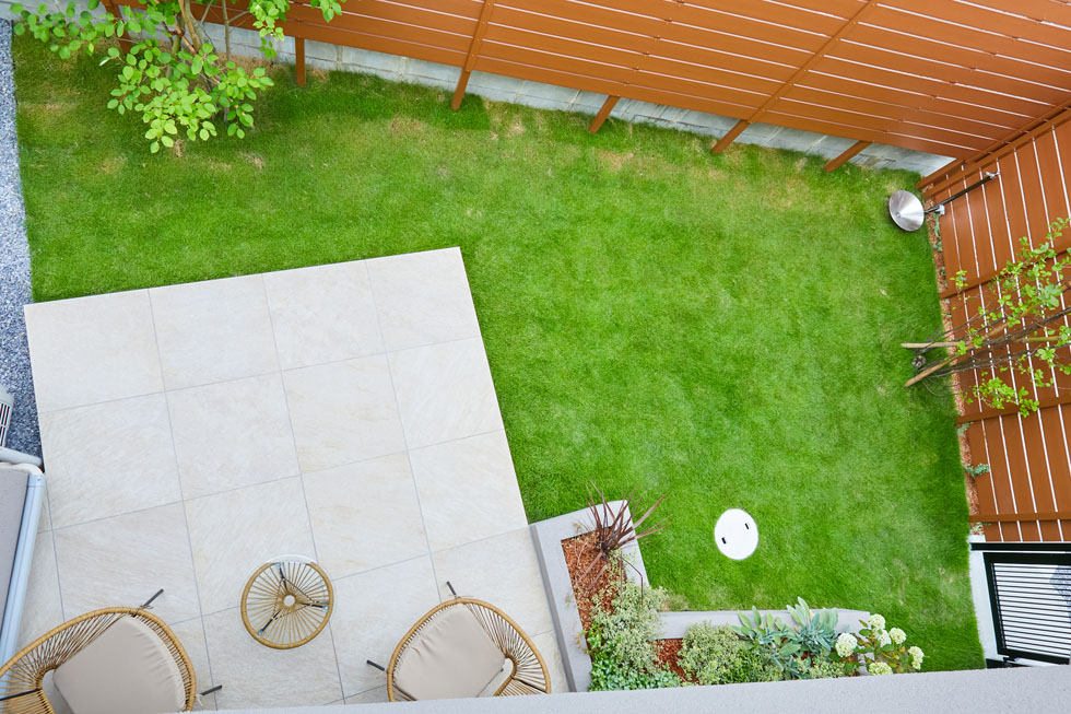 お子様が安心して遊べるよう、芝生と段差の少ないテラスをデザインすることで、庭全体が一体感のある広々とした空間に。 プライバシーに配慮した目隠しフェンスを背景に、 植物をバランスよく配置し、家族でゆっくりくつろげる空間になりました。