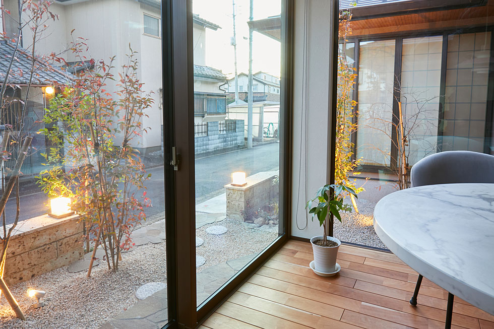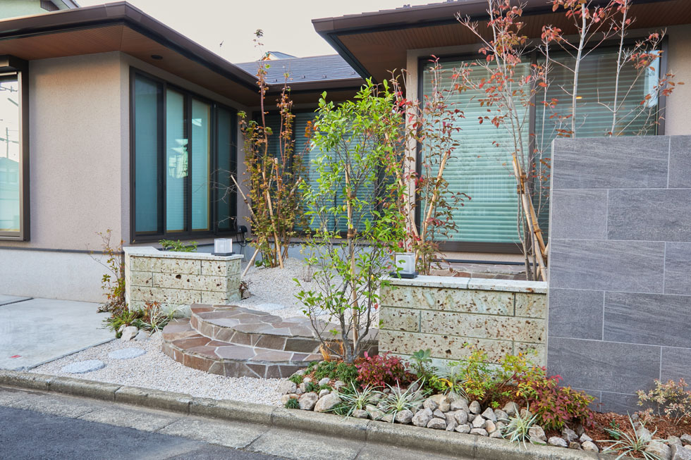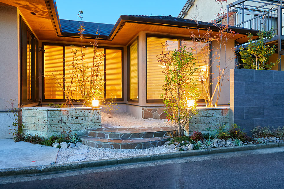 3方向の窓から庭の景色が楽しめるよう、 植栽の位置やバランスを考慮してデザインを行いました。 道路側には、自然石や照明で庭へのアプローチを演出し、 和モダン外構の印象的な見せ場となりました。
