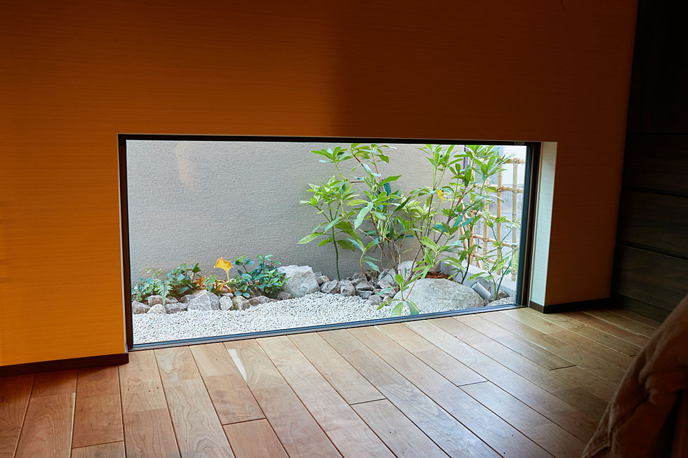 寝室の地窓からも、和の景色が眺められるよう、坪庭を設えました。 ここでも地面の高さを窓のすぐ下まで上げることで フローリングのすぐ先に庭が拡がるよう演出しています。
