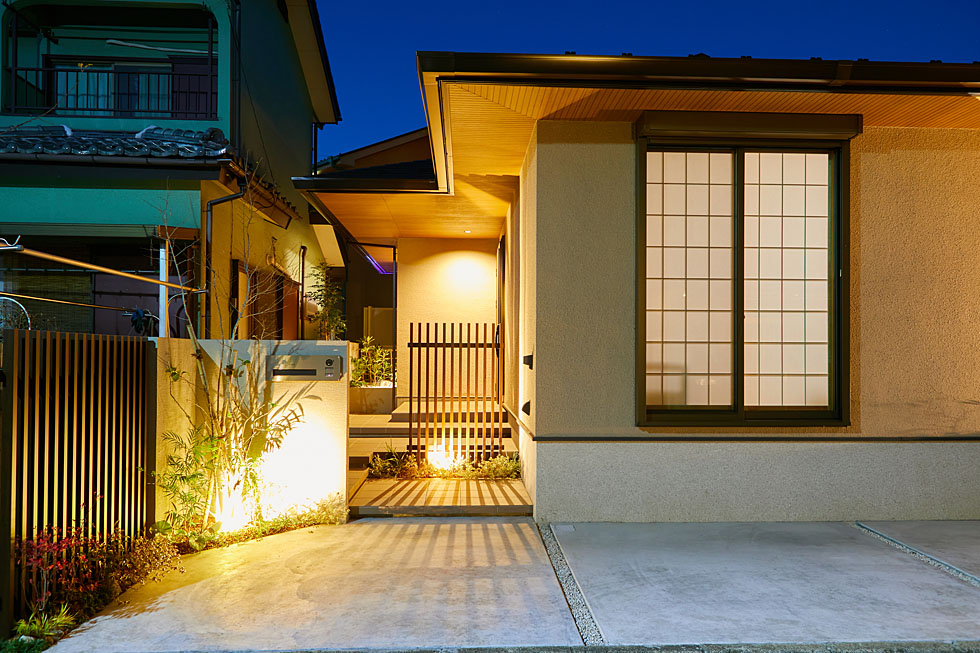 玄関アプローチには、 車椅子での出入りにも対応できるゆったりとした階段に、 ウォールを組合せ、見え隠れするような演出を行いました。 夜になると縦格子から照明の影が落ち、陰影が楽しめます。 家族やゲストをお迎えする特別な空間になりました。