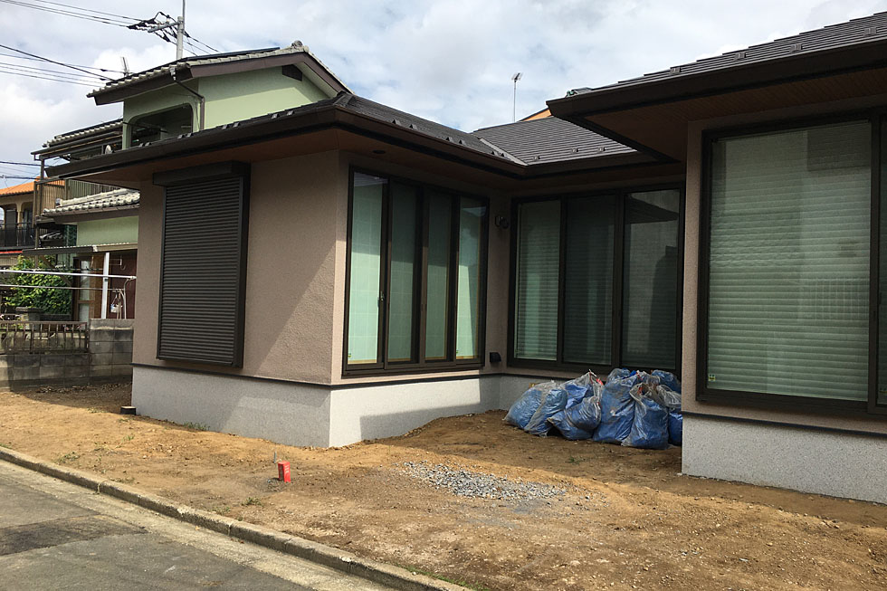 和モダンな外観の平屋のご自宅。 建物の雰囲気にあう、石材や植物などの自然な素材を使用した外構デザインをご要望でした。 また、3方向の部屋から面した庭があり、季節に応じた植物を眺めながら、家族でくつろげるような空間にしたい、とのご相談でした。