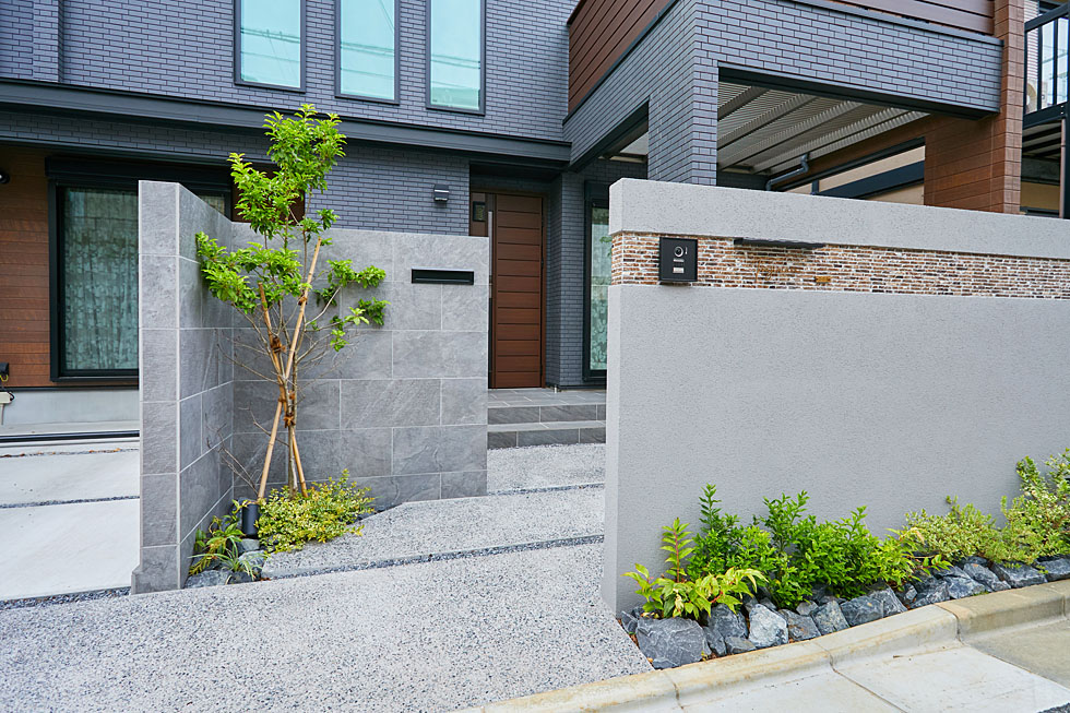 ブラックの外壁に木調のアクセントのあるご自宅。 グレーでシックな雰囲気の外構デザインにしたいとのご要望でした。 また玄関やお子様のお部屋が道路に面しているため、 道路からの視線を遮り、プライバシーを確保しつつ、 デザイン性も保ちたいとのご相談でした。