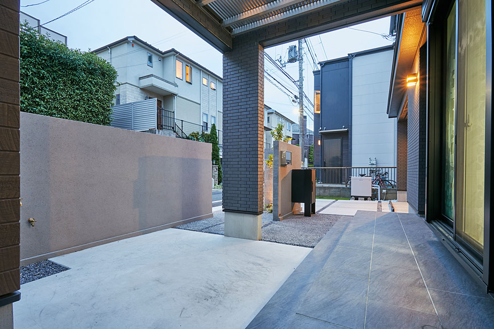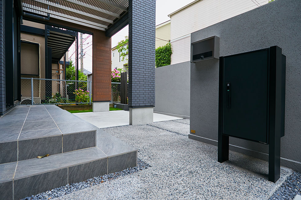 ウォールの裏側には、宅配ボックスや水栓を設置し、機能性をもたせています。 また、道路からの視線を適度に遮ることで 自転車を停めたり、お子様が安心して遊べる空間になりました。